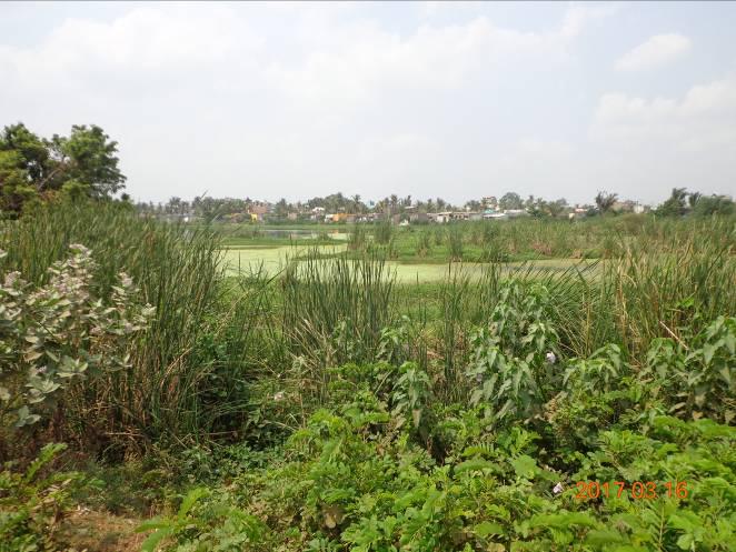 This is a fairly large lake with water. The area surrounding the lake is urbanized. The bund in the Western side is almost encroached to the full extent. The bund in the northern side is fairly compact but with dense thorny bushes. The pond is dumped with solid waste, liquid waste is diverted into the pond; direct sewage is let into the pond from the houses located along the bund. As the water body is covered with dense bushes all around, Total Station Survey Could not be conducted in this pond. Hence the area and bund length was estimated through Google earth. Based on the Google earth output, it is inferred that the total area of the pond is 22,226 sq.m and the total length of the bund is 775.9 m