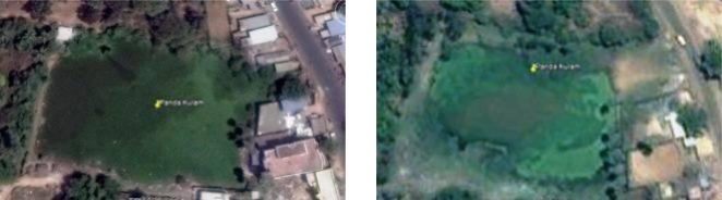 The imagery extracted from google earth on 21.03.2016 and 01.06.2002 is presented below. Even though no major changes could be detected, at ground, encroachment is happening on the northern bund and also liquid waste is diverted into the pond.