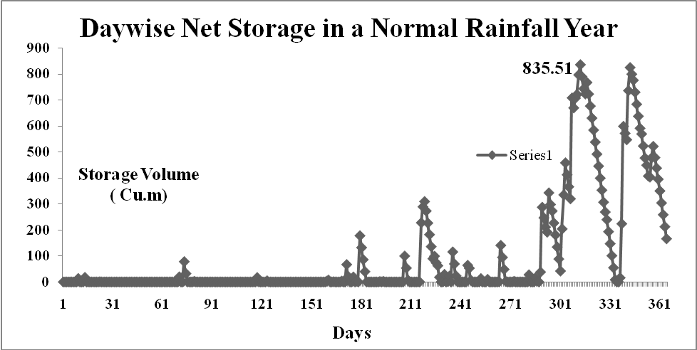 The total storage of the tank in its present condition is estimated at 8,698.9 cu.m Based on this estimate, there will be water available in the pond for almost 119 days in a year. At no point of time, the pond overflows in a normal rainfall year. The total inflow to the tank in a normal rainfall year is estimated at 5,117.77 cu.m; the total groundwater recharge will be 3,613.13 cu.m. The estimate was made in an excess rainfall year ie., during 2005 to see the inflow and outflow status. The actual volume stored in the tank after losses due to evaporation and recharge is given in the following graph.