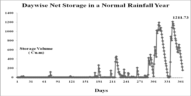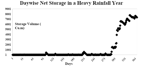 Based on this estimate, there will be water available in the pond for 139 days. The pond in its present volume does over flows for less than a week in an excess rainfall period for the assumed catchment. The total net inflow to the tank in an excess normal rainfall year is estimated at 424,761 cu.m; the total groundwater recharge is 6051.61 cu.m.