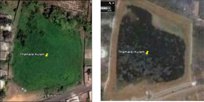 The imagery extracted from google earth on 21.03.2016 and 07.05.2007 is presented below shows no appreciable change but at site it is evident that the pond is subjected to severe dumping of solid waste and liquid waste diversion.