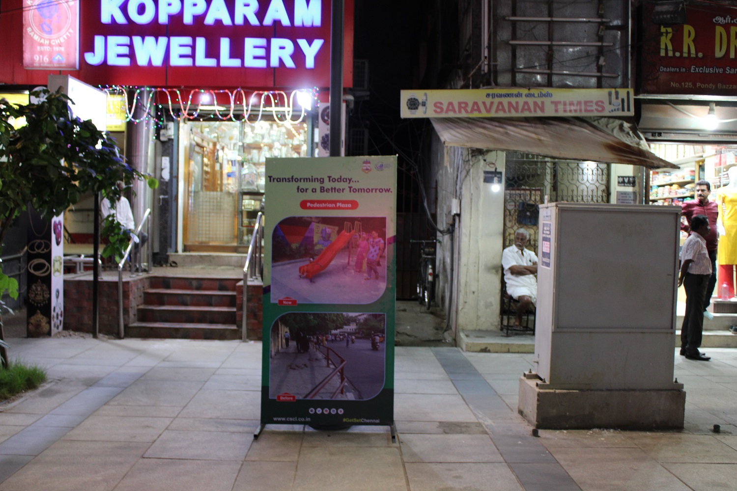 சென்னை தி. நகரில் உள்ள பாண்டி பஜார் பகுதியில் கடைகள் மற்றும் விற்பனையகங்களின் வாசலில் வாகனங்கள் நிறுத்துவதைத் தவிர்த்து சாலையைச் சீரமைத்து பாதசாரிகளின் வசதிக்காக அகன்ற நடைபாதை அமைக்கும் பணிகள் நிறைவேற்றப்பட்டுள்ளன. மூத்த குடிமக்கள், மாற்றுத் திறன் கொண்டோர் மற்றும் அனைவரும் சுலபமாய் நடந்து செல்லவும், ஷாப்பிங் செய்யவும், உணவகங்களில் பசியாறவும், போக்குவரத்து நெரிசல் போன்ற எவ்வித இடையூறுகளும் இன்றி சாலையைக் கடக்கவும் வசதிகள் செய்யப்பட்டுள்ளன. இதனால் சுற்றுலாப் பயணிகளுக்கும் மாநகர் சார்ந்த மக்களுக்கும் இது ஒரு விருப்பமான இடமாகத் திகழ்வதுடன் பொருளாதார வளர்ச்சிக்கும் உறுதுணையாய் பெடஸ்ட்ரியன் ப்ளாசா விளங்கும் என்பது திண்ணம்.